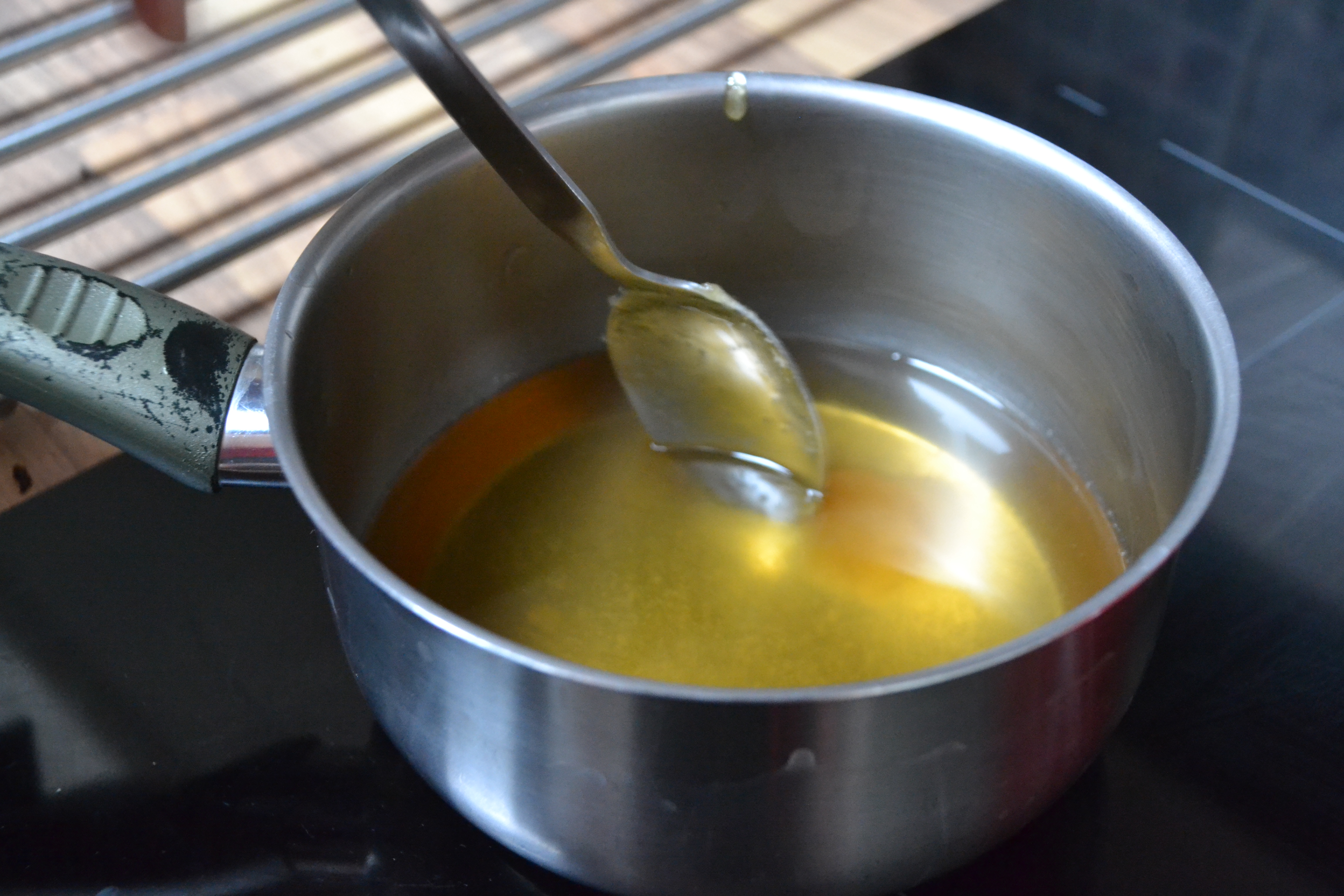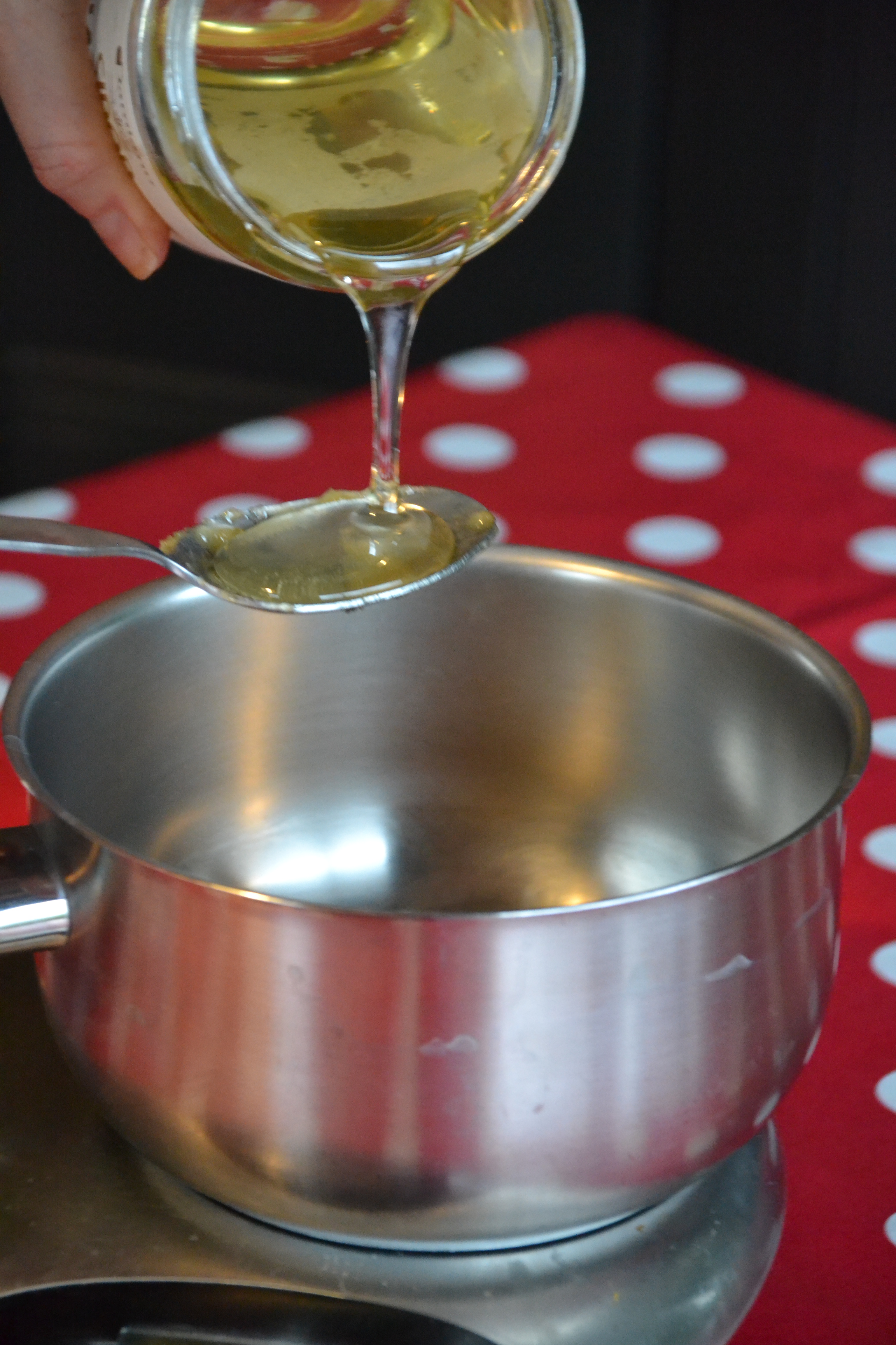 On commence ? On allume le four chaleur tournante à 160°ou thermostat 5/6. Puis dans une casserole sur feu doux mélanger le sirop d’agave et le miel.