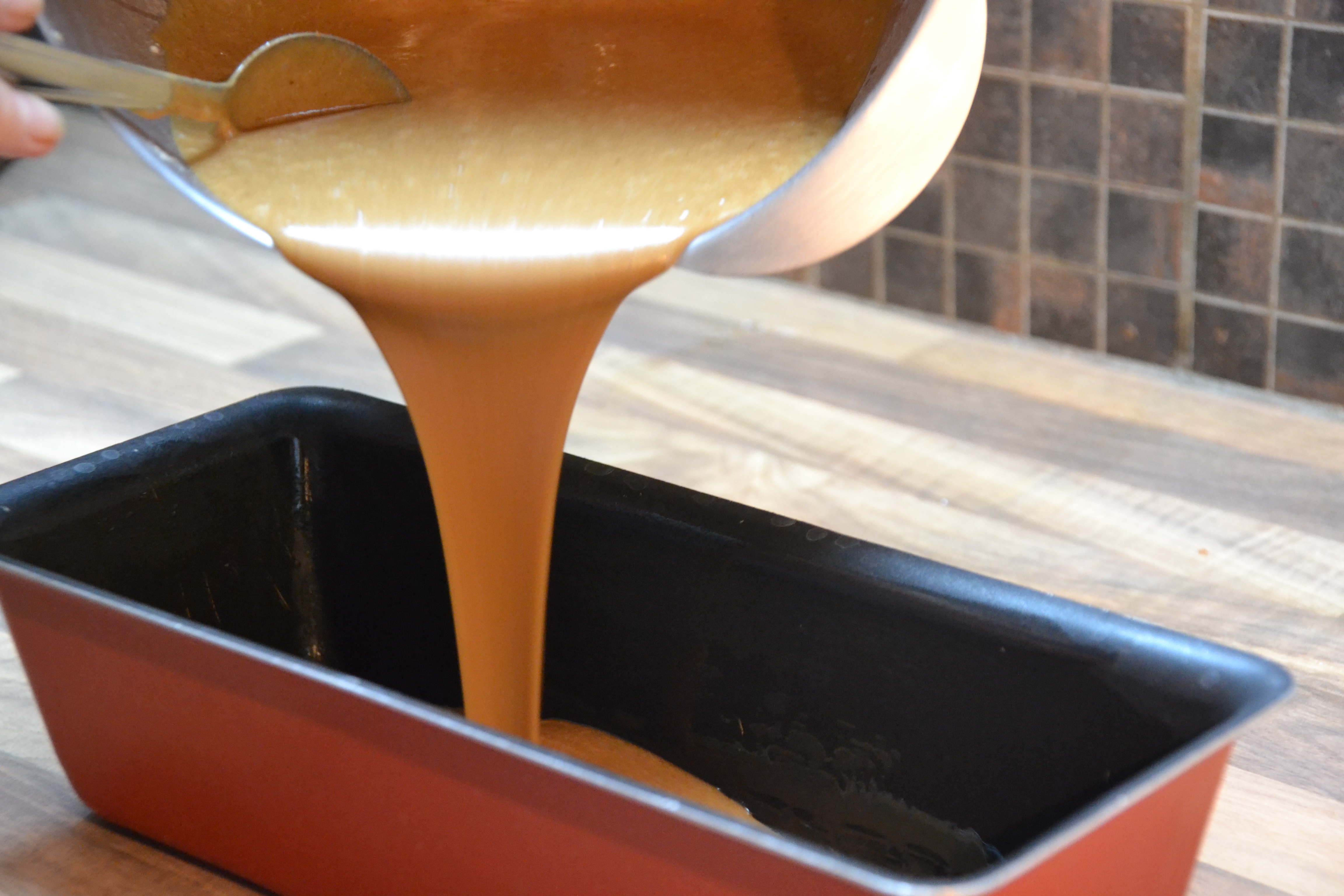 Et hop au four ! En le sortant 1h après le laisser refroidir. Ne le démoulez qu’après complet refroidissement. Au niveau du résultat la pâte peut-être plus ou moins liquide (elle est très liquide sur ma photo) et le pain d’épices peut-être plus ou moins foncé, les 2 éléments sont fonction de la texture et de la couleur du miel utilisé.
