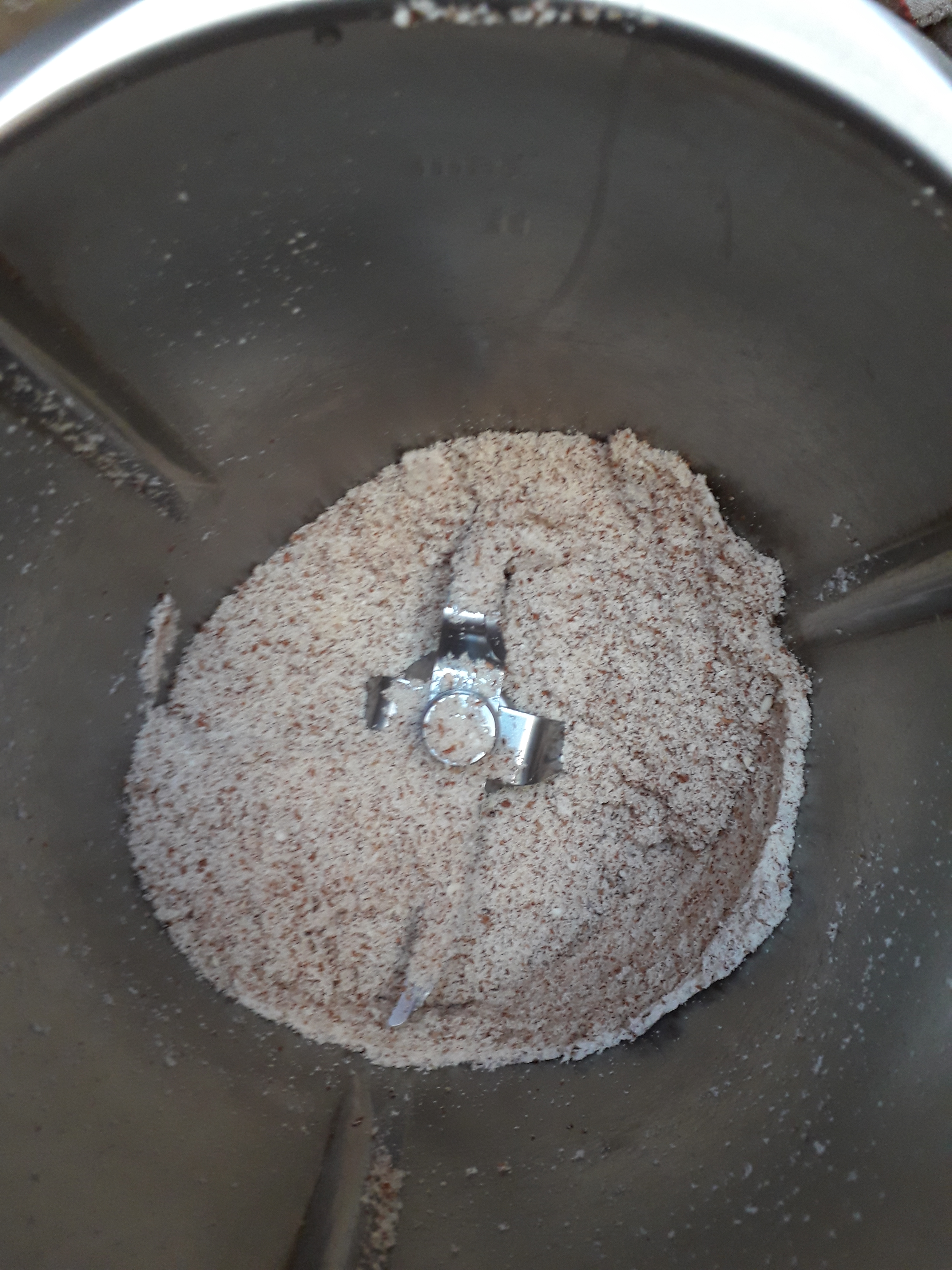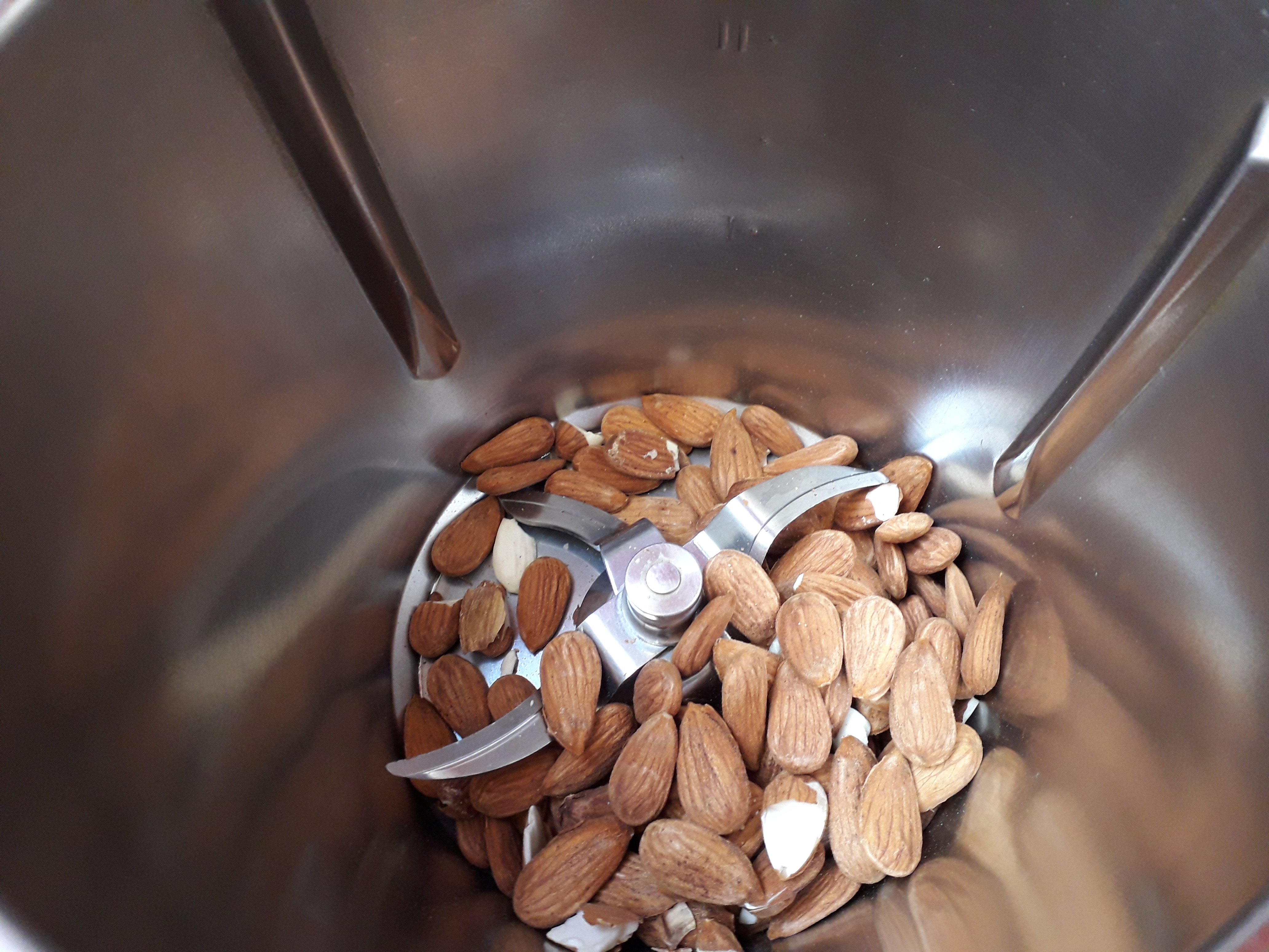 Mettre les amandes dans le bol de Momix (mon thermomix !) et mixer 10 secondes vitesse 9. Réserver dans un bol.