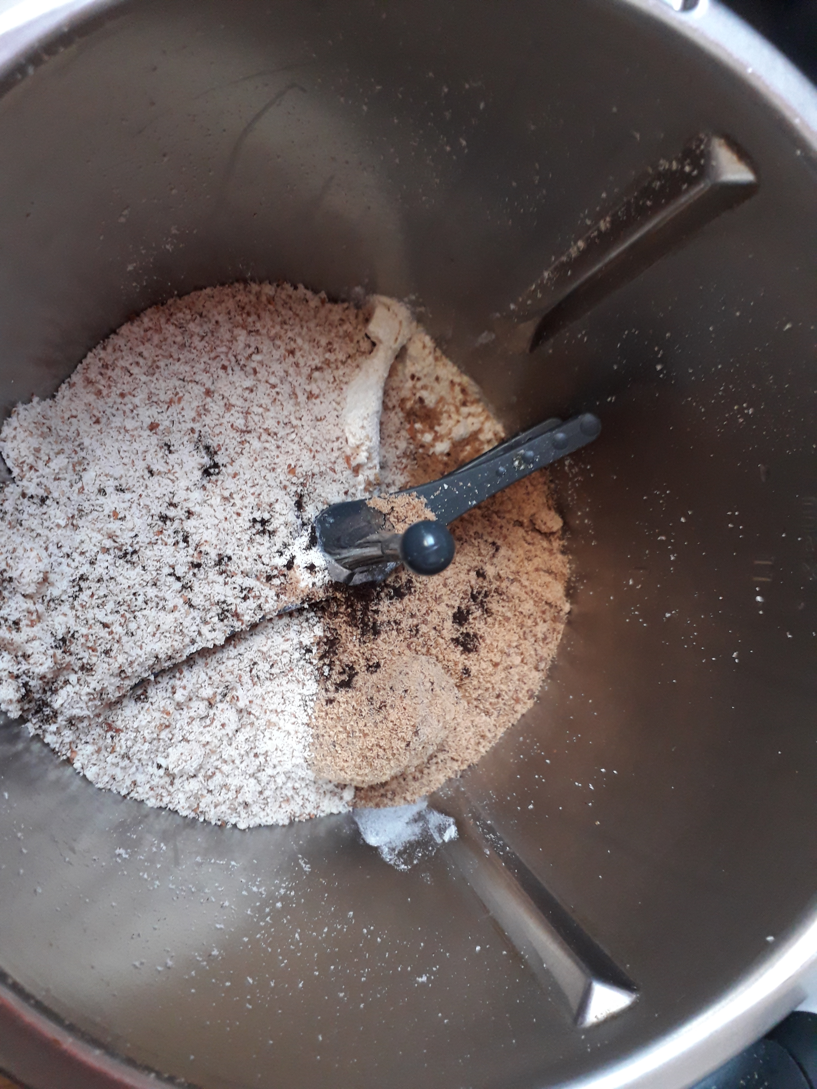 Insérer le fouet dans le thermomix puis ajouter le mix pâtisserie, la rapadura, le sucre vanillé et la poudre d’amandes. Mélanger 10 secondes vitesse 2.