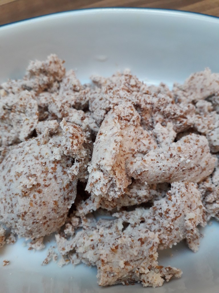 Donc vous voilà avec votre reste de lait végétal….qu’il soit d’amandes ou de noisettes c’est la même chose. On sort la matière restante de l’étamine. Ce sont des blocs de matière humide. Écrasez les à la fourchette.