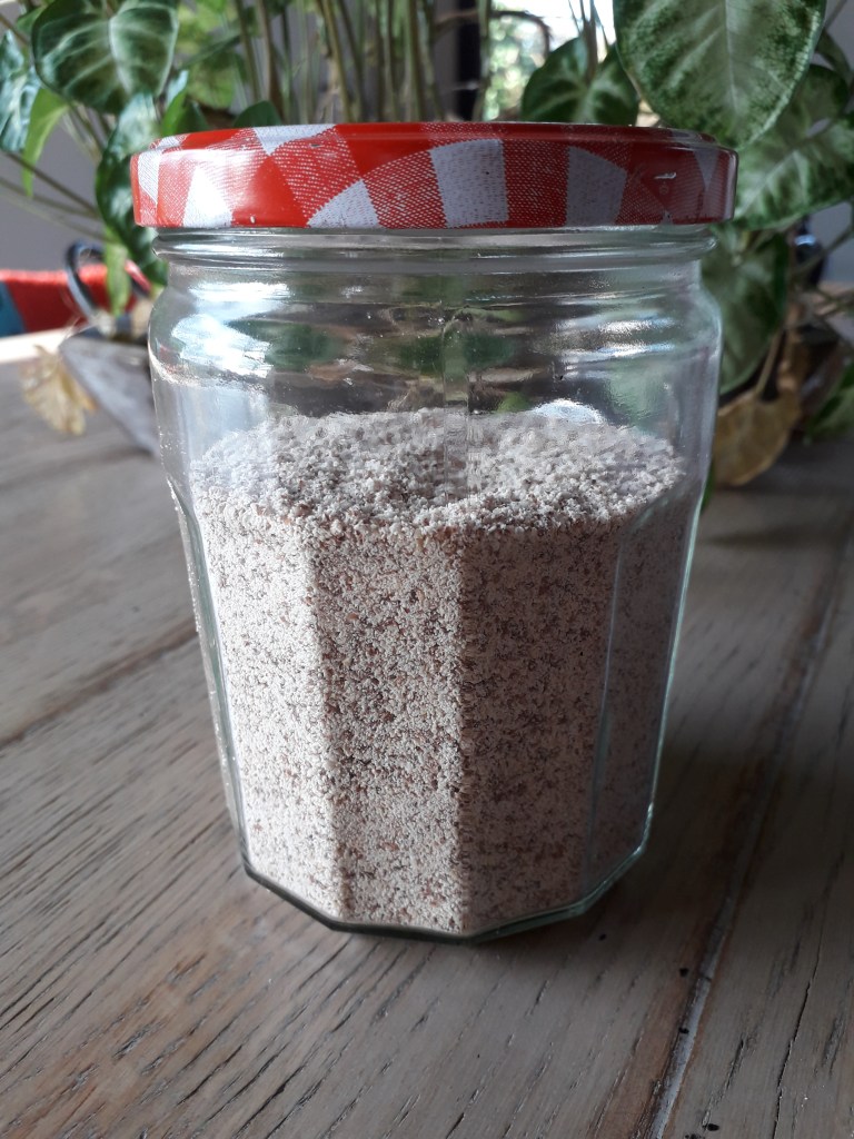 Cette farine est riche en fibres et pauvre en gras. Personnellement je ne l’utilise que séchée en farine, mais elle peut être utilisée humide, il faudra pour ce faire allez voir sur d’autres blogs car je n’ai encore jamais tenté.