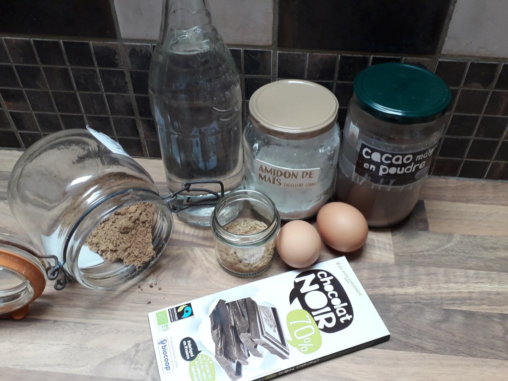 INGRÉDIENTS pour 5 crèmes de 110 grammes ou un pot de 550 grammes : 500 grammes de lait de riz + 2 œufs + 100 grammes de chocolat noir à 70% + 10 grammes de cacao amer + 15 grammes d’amidon de maïs + 20 grammes de sucre rapadura.