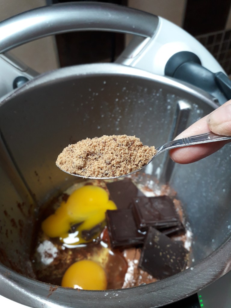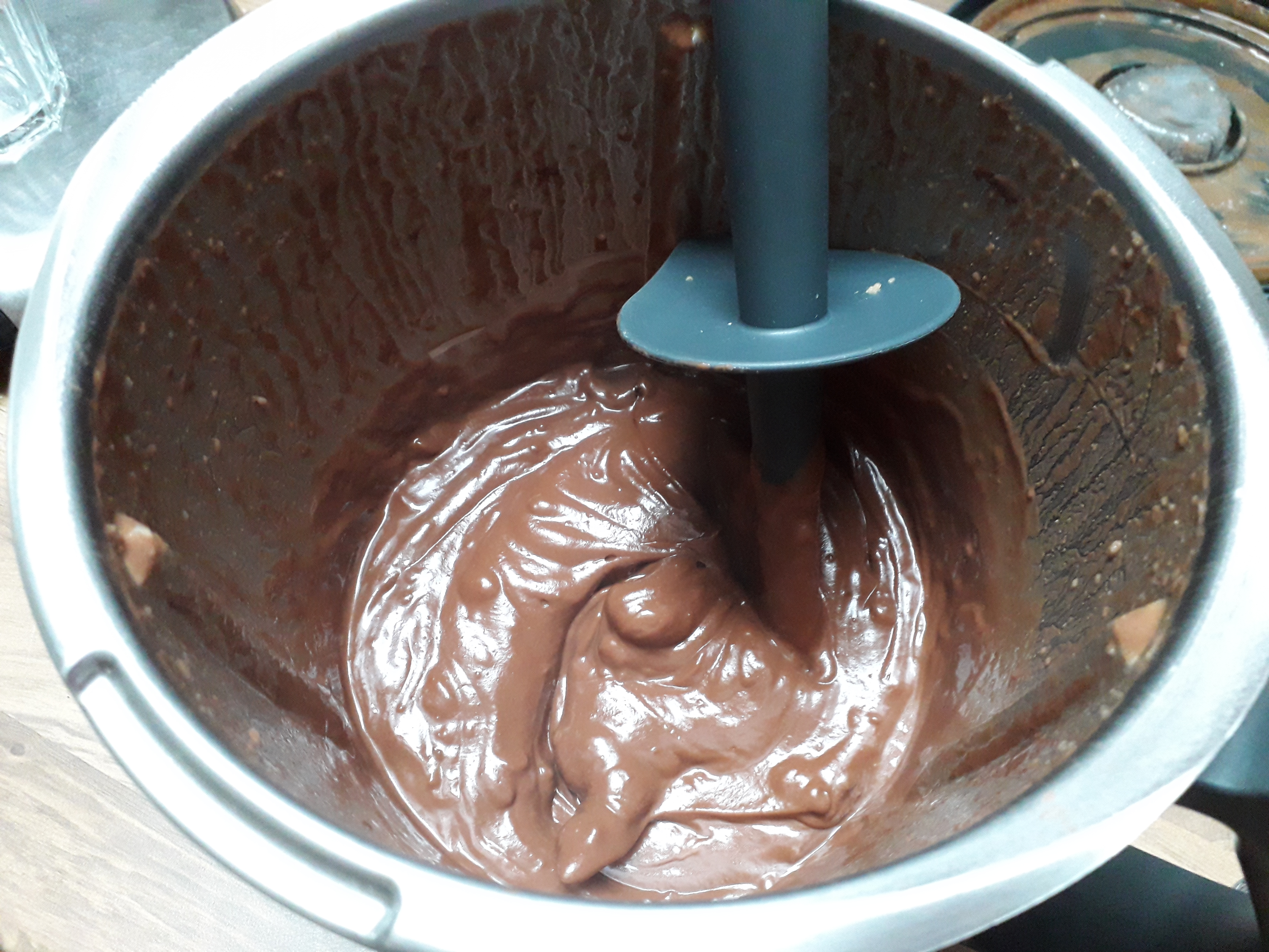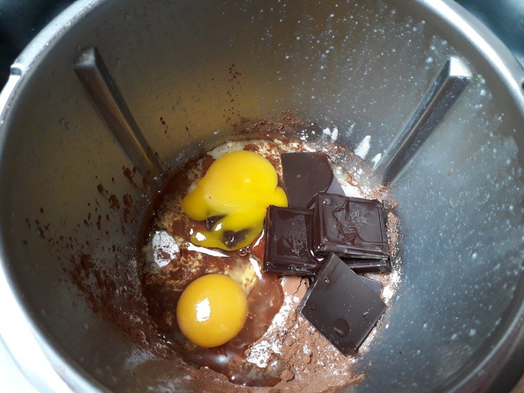 On commence par réaliser la moitié de la recette du lait de riz pour obtenir 500 grammes. Laissez le lait dans le bol du Thermomix et y ajouter les 100 grammes de chocolat en morceaux, les 10 grammes de cacao amer, les 15 grammes d’amidon de maïs, les 2 œufs puis les 20 grammes de sucre rapadura. Mettre les œufs à la fin pour éviter qu’ils ne « cuisent » sur le lait de riz encore chaud.
