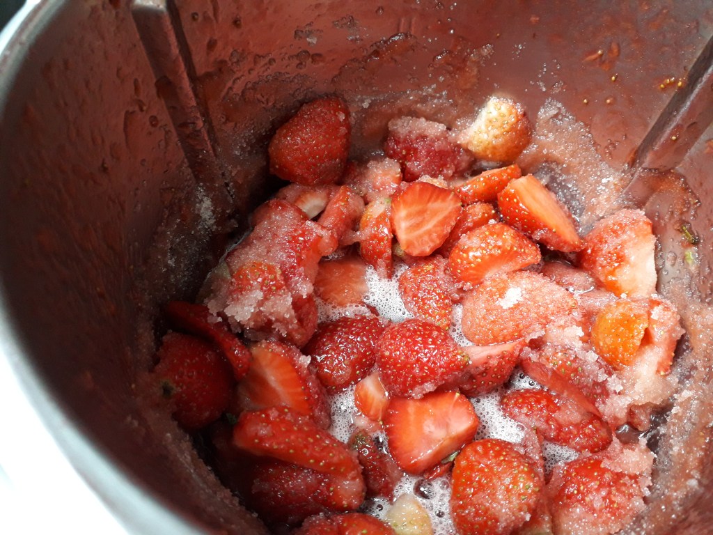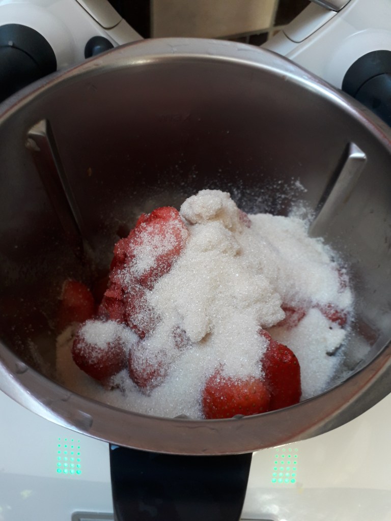 Démarrons par le lavage et l’équeutage des fraises. Vous en mettez 700 grammes dans le bol du Thermomix que vous recouvrez de 400 grammes de sucre de canne. Remuez 30 secondes/sens inverse/mijotage puis réservez 15 minutes.