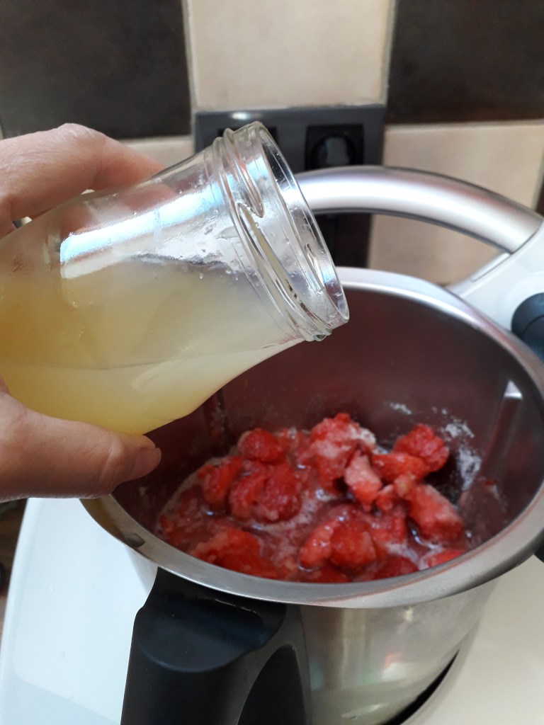 Passez ce temps ajoutez 10 grammes de jus de citron sur le mélange fraises/sucre puis cuire 18 minutes/90°/Vitesse 2. La température est importante car avec les fruits rouges si vous dépassez 90° ça les cuit et ils « virent ».