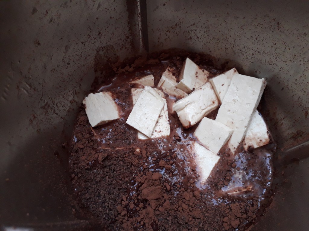 Commencez par mettre le chocolat en morceaux dans le bol du robot et mixez 5s/vitesse 8. Raclez puis ajoutez le chocolat amer, le lait, le tofu en morceaux, le sucre, les jaunes d’œufs.