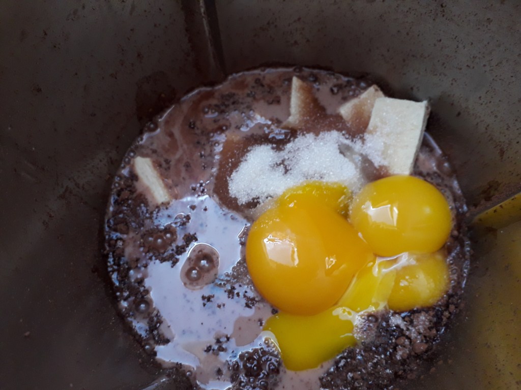 100 g de chocolat à 70%, 50g de cacao amer, 400g de lait végétal, 200g de tofu nature (ou soyeux), 150g de sucre de canne, 4 jaunes d’œufs.