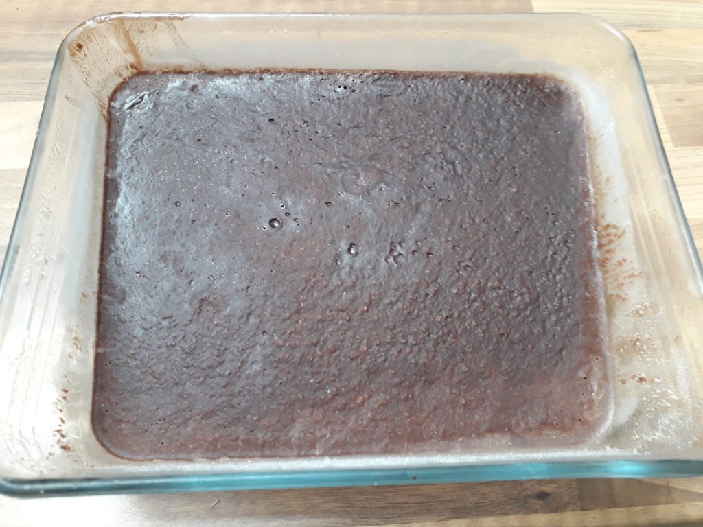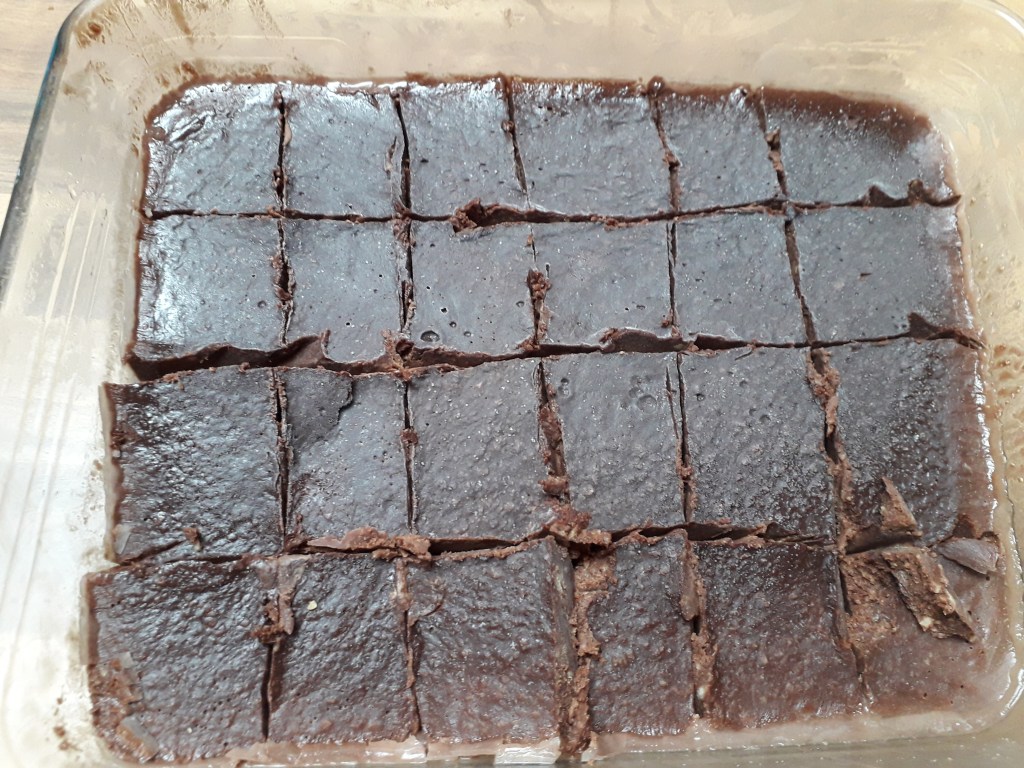 Le lendemain, sortez votre plat et mettez le au réfrigérateur pendant 15mns. A l’issue, découpez des petits dés de chocolat congelé et remettez en la moitié les dans le bol de Momix.