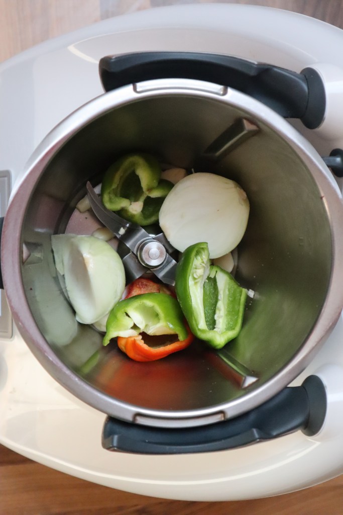 Démarrez par le lavage des poivrons. Épépinez les, puis épluchez ail et oignons. Mettez le tout dans le Thermomix 3 secondes/vitesse 5.