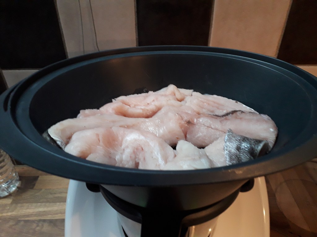 Poser le couvercle, puis le varoma. Déposez-y les filets de poisson, le chorizo, les petits pois et les crevettes décortiquées.