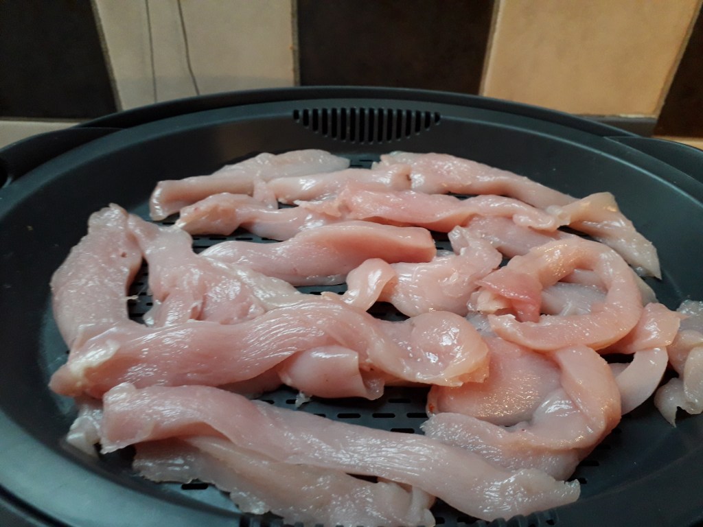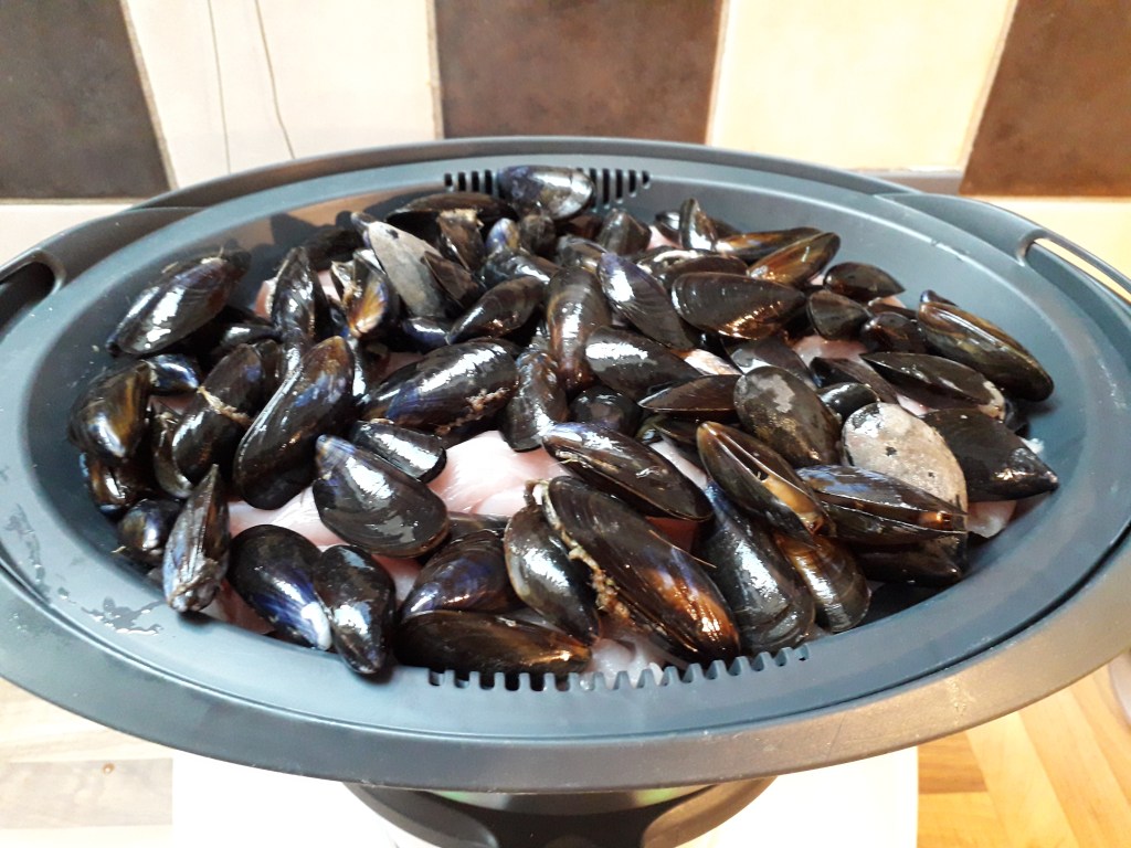 Sur le plateau supérieur du varoma, déposez le poulet coupé en morceaux ou lamelles et les moules puis fermez le couvercle.