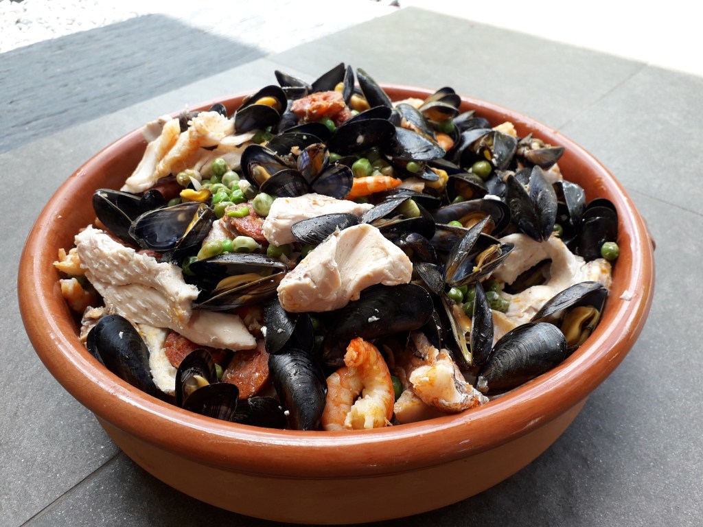 Bien entendu, il s’agit d’une paëlla sans gluten, sans lactose ni sulfites …..qui a dit qu’on mangeait mal avec un tel régime ?