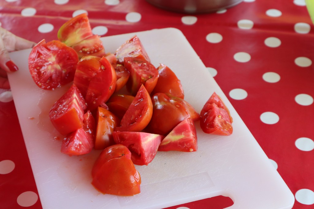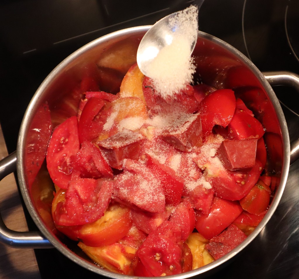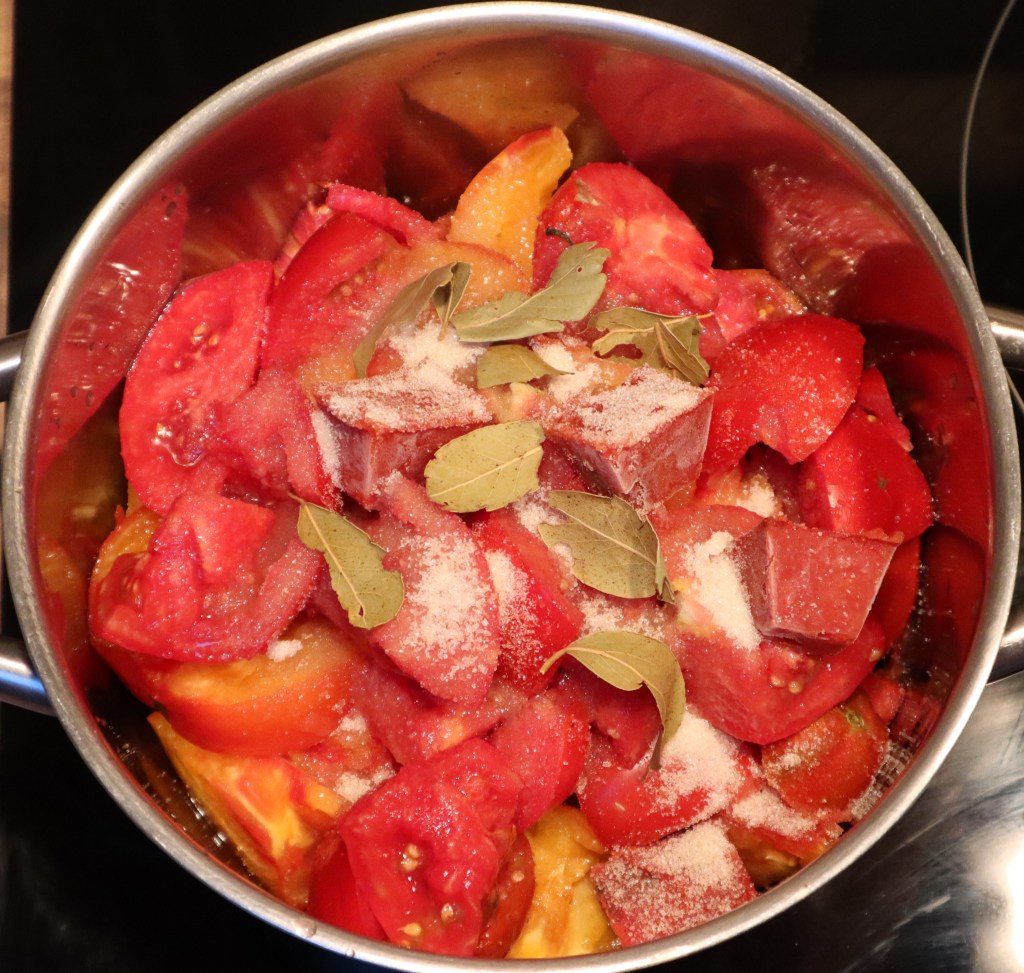 Lavez et équeutez les tomates. Coupez les en morceaux et mettez les dans une petite cocotte avec 3 cuillères à soupe de sucre et 6 feuilles de laurier. N’en ayant pas dans le jardin, j’en achète séché en magasin bio. Ajoutez 70 grammes de concentré de tomates. Moi j’utilise le concentré de tomates que je fais moi même avec Momix 😉 Portez à ébullition, puis baissez à toute petite ébullition pendant 1h15.