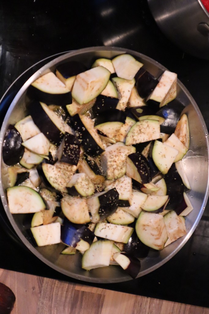 Lavez et équeutez les aubergines. Les coupez en menus morceaux. Faire chauffer 6 cuillères à soupe d’huile pendant 2 minutes à vif. Baissez, puis déposez les aubergines avec 2 cuillères à café d’Origan (j’achète aussi du séché en magasin bio) et 1 cuillère à café de poivre. Mélangez les régulièrement en les laissant cuire 15 minutes sur feu moyen.
