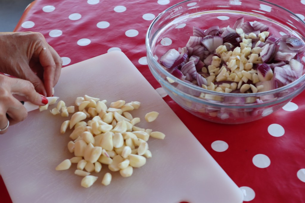 Au tour du pelage de l’ail et l’oignon. J’avoue, pour l’ail on rêverait d’avoir un commis de cuisine…si vous avez un ado qui traine dans les parages, moi je n’hésite pas 😉 Je mixe 10 secondes à vitesse 5 au Momix. Vous pouvez les coupez en petits morceaux. Ressortir une deuxième cocotte et y mettre 4 cuillères à soupe d’huile pendant 2 minutes à vif. Baissez et versez le mélange ail/oignons avec 2 cuillères à café de thym séché pendant 10 minutes. Si vous avez du thym frais vous le déposerez directement sur le mélange ail/oignons cuits.