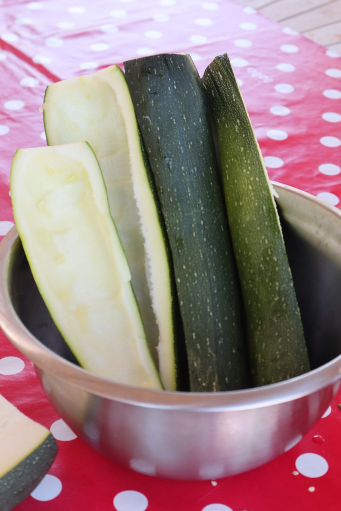 Et qu’est ce qu’il nous reste ??? Mesdames les courgettes…..on les lave, coupe les extrémités, les épépinent et les coupons en morceaux.