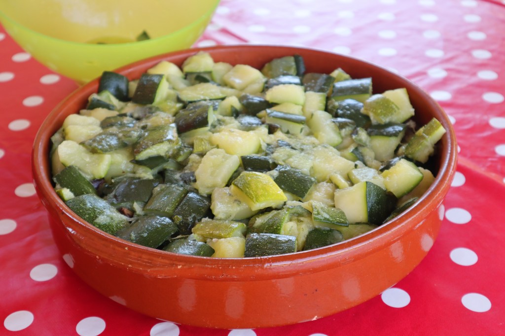 Reprenons la cocotte des aubergines, y mettre 6 cuillères à soupe d’huile d’olive à feu vif pendant 2 minutes, baissez et mettez les courgettes pendant 20 minutes. Mélangez les régulièrement.