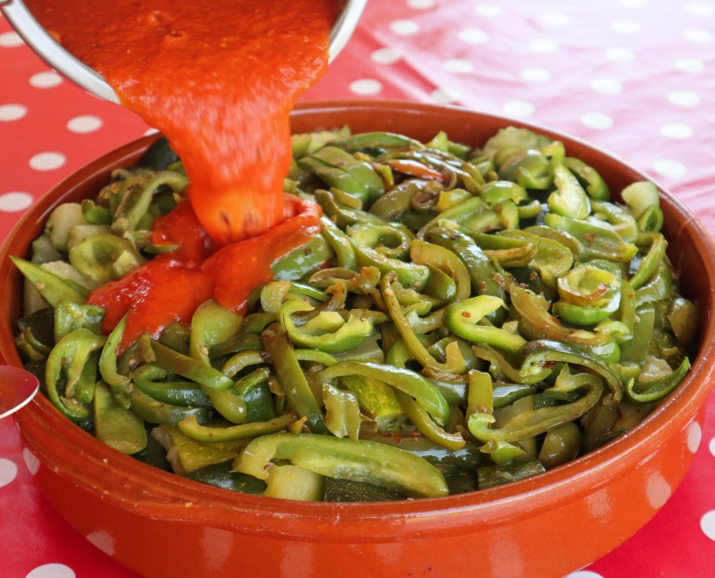 Dans la même cocotte que les oignons, remettre 4 cuillères à soupe d’huile à feu vif pendant 2 minutes. Baissez et déposez-y les poivrons avec 1 cuillère à café de fleur de sel pendant 15 minutes.