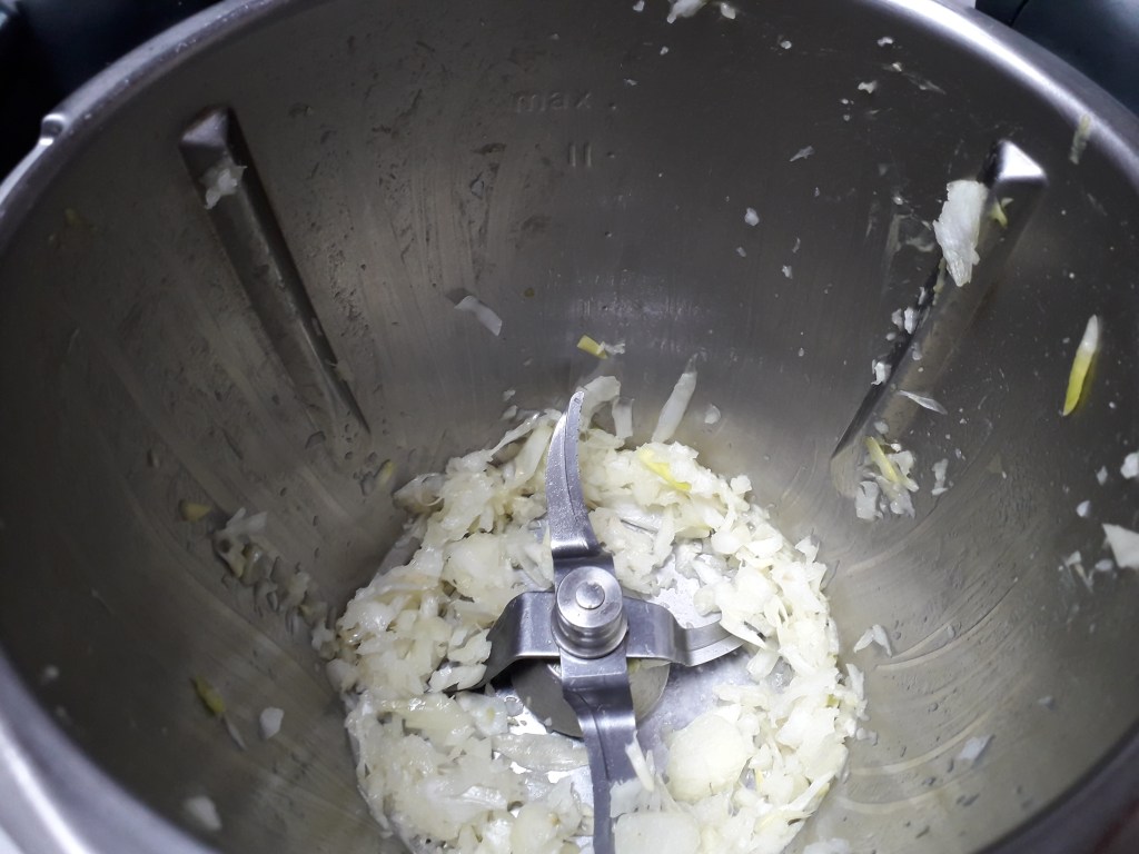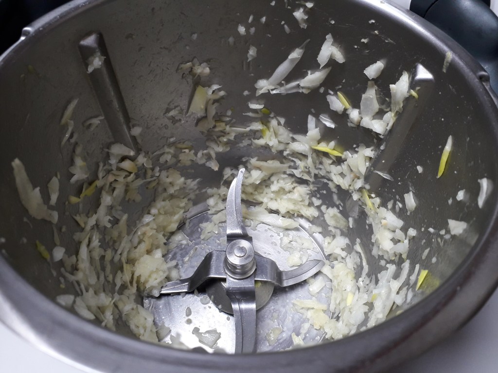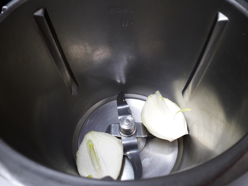 MOMIX entre en scène (ou l’un de ses concurrents;)) Mixez l’oignon 5s/vit5 puis ajoutez 30 grammes d’huile et cuire 3mns/90°/vit 2.