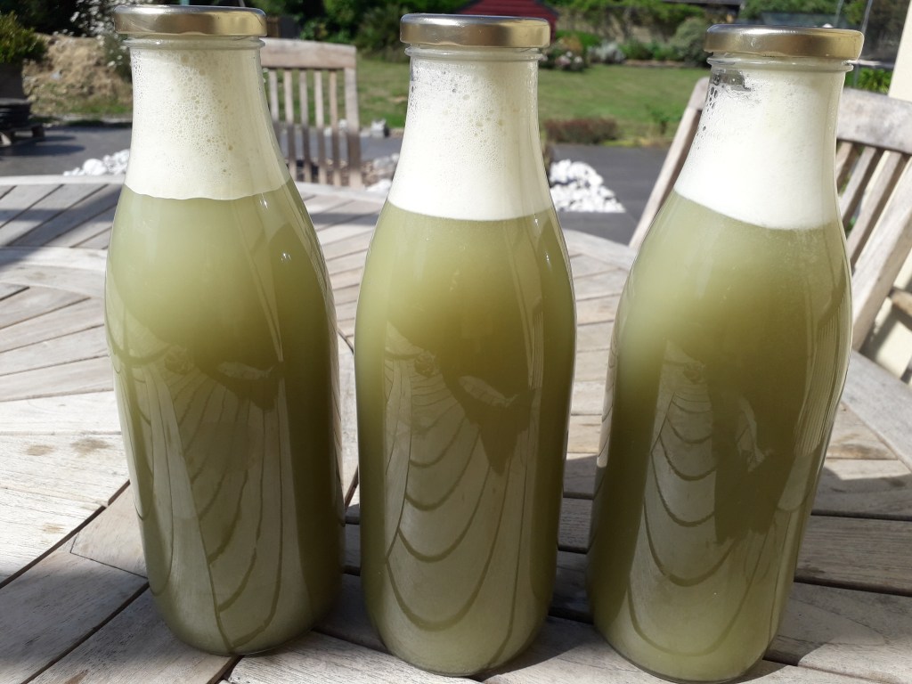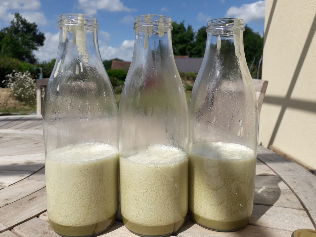 Répartir cette préparation dans les 3 bouteilles, vous avez environ 320 à 340 grammes par bouteille, puis complétez avec de l’eau. Agitez.