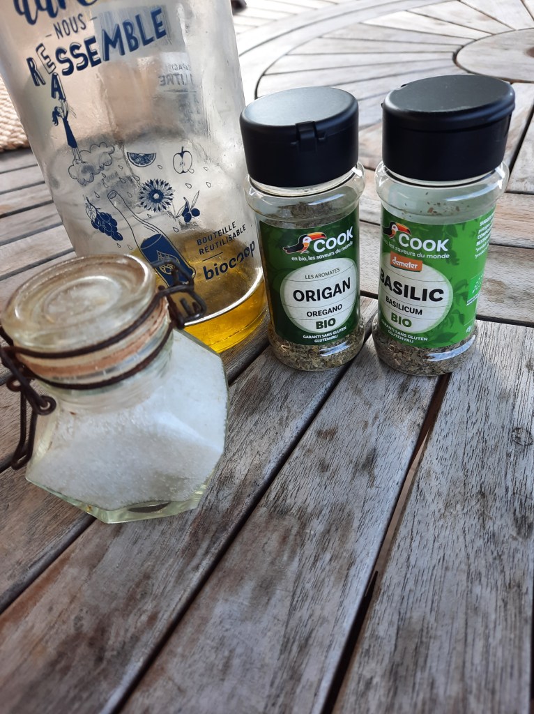 J’achète mes tomates bio au marché le plus proche de chez moi, l’huile en bidon de 10l à la biocoop (sur les grosses quantités vous bénéficiez de 5% de réduction), les condiments et épices également en biocoop.