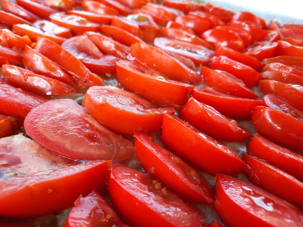 Coupez les tomates en tranches, pas trop fines car elles bruleraient, trop épaisse elles seront moins confites. Sur une tomate moyenne je coupe 8 tranches.